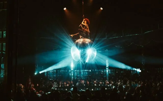 There’s Moscow’s swol ‘wunderkind’ Syvat and the gorgeous Zoë tumbling through space; Miranda Menzies, fresh from Gatsby at the Green Light at the Opera House, spinning to a blur while suspended from her titanium-strength bun. America’s Nate the klutzy drag clown juggles in high heels on a pogo stick; Bulgaria’s Maria kills to a Kiss track in high red-leather boots on a BDSM-coded chain; and super-ripped Russian Danik hops upside down on a single hand along a teetering scaffold. In one of several numbers, returning Strut songstress Rechelle sits astride that enormous disco ball belting Norah Jones’ ‘Turn Me On’.