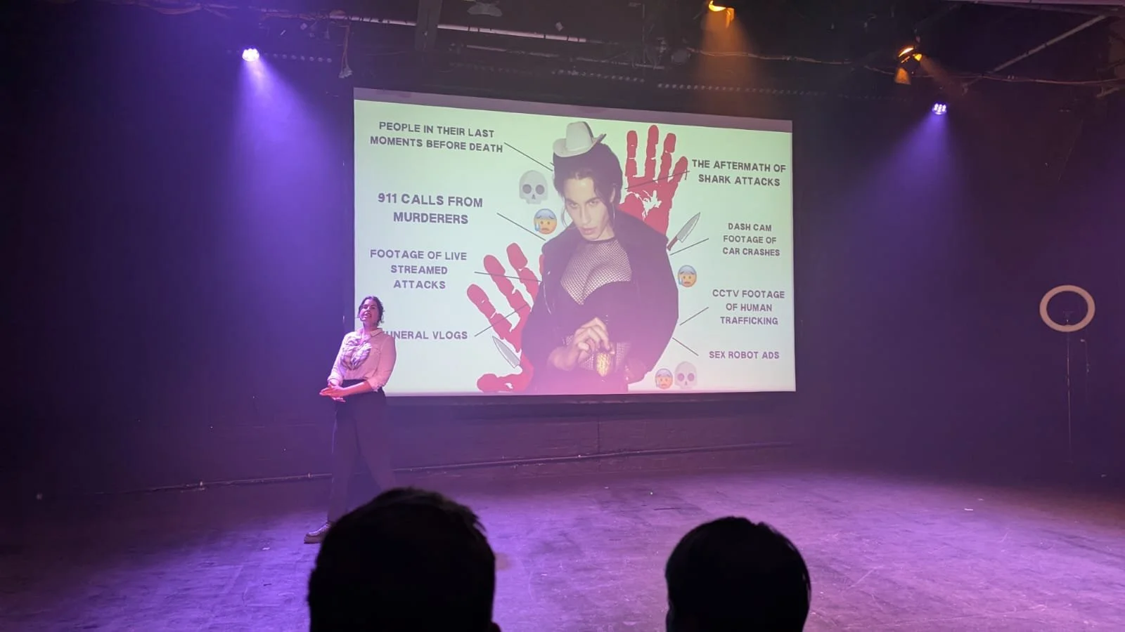 Otton enters stage left singing a TikTok karaoke of ‘A Whole New World’ while behind her strangers livestream (with casual net-speak commentary) the worst thing that’s ever happened to them. Her heaps-entertaining stage persona is a hot millennial mess of drama slut, hyperaware screen addict, and shameless oversharer. Over one hypercreative hour, she serves us a skittering presentation on our collective dystopia through powerpoints, pie charts, a poem, a live ECG reading of brain rot, a death challenge, a recreation of her chubby tween self sending horny texts in an AOL chatroom, and so, so much cursed content – taking us on a dark and demented journey through the internet generation’s tweaked up, brain-rotted brain.